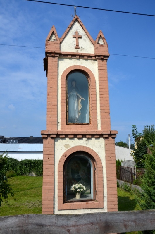 Kaplica stoi przy głównej drodze przebiegającej przez wieś. Wzniesiona jest na planie kwadratu na ceglanej i otynkowanej podmurówce. Dwukondygnacyjna kaplica nakryta jest dwuspadowym dachem. W elewacji frontowej posiada dwie duże półokrągło zamknięte i przeszklone wnęki, a w ścianach bocznych półokrągło zamknięte płyciny. Naroża kaplicy, gzymsy, wnęki oraz płyciny ozdobione są czerwoną cegłą. We wnęce pierwszej kondygnacji znajduje się obraz przedstawiający Matkę Bożą z Dzieciątkiem, a w górnej umieszczona jest ludowa figura Matki Bożej.