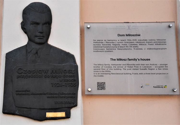 W kamienicy znajdującej się w Suwałkach przy ul. Hamerszmita 10, w latach 1926 – 1935 mieszkali: Weronika, Aleksander i Andrzej Miłoszowie (rodzice i brat poety). Dnia 30 października 2006 roku na murze budynku została odsłonięta pamiątkowa tablica zaprojektowana przez Bohdana Chmielewskiego. Celem było upamiętnienie związku Czesława Miłosza z Suwałkami, który w w/w latach, podczas nauki w Wilnie tu właśnie przyjeżdżał. Po wielu latach na Suwalszczyznę przyjeżdżał jeszcze pięciokrotnie: we wrześniu 1989 roku oraz w czerwcu 1992,1993,1994 i 1997. Zatrzymywał się w klasztorze pokamedulskim nad Wigrami.
