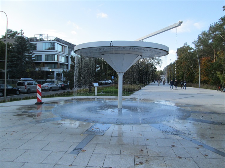 Zegar wodny wskazuje rzeczywisty czas astronomiczny. Posiada kształt okrągłej tarczy na której znajdują się: wskazówka godzinowa, oznaczenia godzinowe, wskazania minutowe i sekundowe. Wskazówka godzinowa porusza się po obwodzie zadaszenia zegara i poprzez ciągły strumień wody spadający na oznaczenie godziny na tarczy zegara w nawierzchni kamiennej wskazuje na aktualny czas. Minuty wskazuje „przerwa” w ścianie wody utworzonej ze strumieni spadających z zadaszenia na nawierzchnię stalową po obwodzie tarczy zegara. Sekundy obrazuje 60 dysz zlokalizowanych na obwodzie stalowej tarczy zegara. Zegar pięknie prezentuje się po zmroku, kiedy to całość obrazu wodnego dopełnia gra świateł.