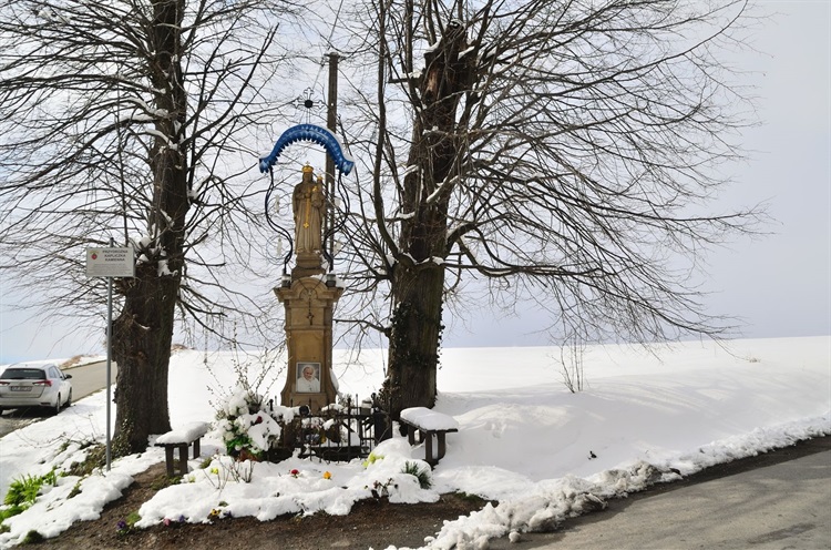 Wykuta w piaskowcu figura przedstawia Matkę Bożą Różańcową trzymającą na ręku Jezusa. Po renowacji figura została pozostawiona w naturalnym kamieniu z wyjątkiem pokrytych złotą farbą koron i różańca. Figura przykryta jest metalowym baldachimem. Stoi na wysokim ozdobnym postumencie. Na cokole zachował się wyryty w kamieniu rok fundacji kapliczki. Otoczona jest niskim metalowym ogrodzeniem.