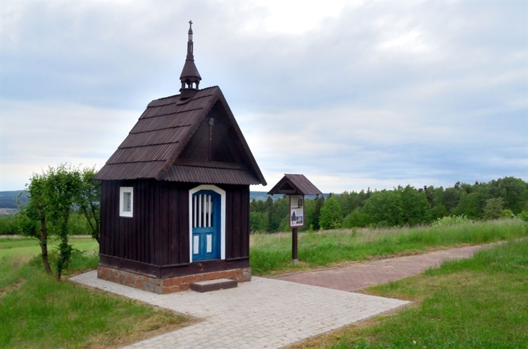 Drewniana kapliczka domkowa została wybudowana w prawdopodobnie w połowie XIX wieku. Jak podaje miejscowa legenda, został postawiona w podzięce za ocalenie przed wilkami żony i dziecka fundatora. Pierwotnie stała na skraju lasu w Świętej Katarzynie, przy granicy wsi. W obecne miejsce została przeniesiona podczas remontu drogi wojewódzkiej w 2007 roku.