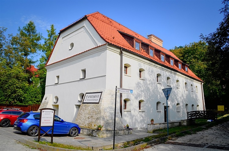 Budynek ma konstrukcję murowaną z miejscowego wapienia. Przykryty jest stromym dachem naczółkowym. Zewnętrzne ściany zachowały oryginalną formę. Podczas ostatniego remontu w dachu zostały wykonane lukarny, umożliwiające wykorzystanie poddasza na cele mieszkalne. Wnętrze zostało radykalnie przebudowane i dostosowane do nowego przeznaczenia. Odtworzono też brakujące szkarpy i częściowo podpiwniczono budynek umieszczając w piwnicy restaurację i salę konferencyjną.