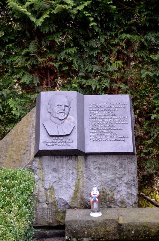 Pomnik znajduje się przy Alej Księdza Biskupa Juliusza Bursche nieopodal willi "Zacisze". Pomnik – tablica pamiątkowa projektu Karola Kubali z Ustronia został odsłonięty 10.11.1985 r. Pomnik to otwarta księga posadowiona na odłamie skalnym. Na jednej stronie znajduje się płaskorzeźba popiersia Juliusza Bursche, a na drugiej informacja o treści "TU W "ZACISZU" MIESZKAŁ W LATACH 1903 – 1939 R. BISKUP KOŚCIOŁA EWANGELICKO-AUGSBURSKIEGO KS. DR JULIUSZ BURSCHE ORĘDOWNIK POLSKOŚCI ŚLĄSKA, MAZUR I WARMII, WIĘZIEŃ OBOZU KONCENTRACYJNEGO ORANIENBURG SACHSENHAUSEN. ZGINĄŁ W LUTYM 1942 R. ZA KOŚCIÓŁ I POLSKĘ".