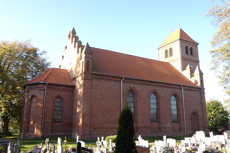 Kościół pod wezwaniem św. Walentego wybudowano w stylu neogotyckim w latach 1897-1899 w miejscu drewnianego kościoła, rozebranego w 1880 roku. W 1936 roku część dachu i wieża zostały zniszczone przez trąbę powietrzną. Wieżę odbudowano wzorując się na wieży kościoła św. Janów w Toruniu. W 1945 kościół uszkodzono w wyniku ostrzału artylerii radzieckiej. W 1997 r przeprowadzono renowację prezbiterium, a w roku 1999, w setną rocznicę poświęcenia kościoła, świątynia została konsekrowana przez biskupa Andrzeja Suskiego.
