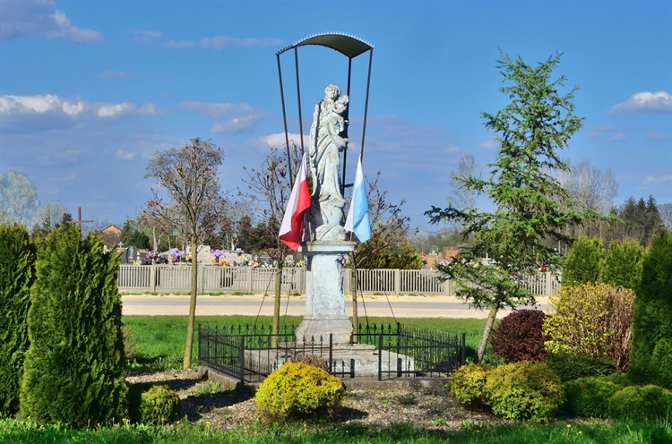 Kapliczka słupowa stoi obok parafialnego cmentarza. Na wysokim postumencie została ustawiona figura Maryi Zwycięskiej. Madonna trzymająca na rękach małego Jezusa, stoi na ziemskim globie, przygniatając stopą głowę węża oplatającego Ziemię. Ziemia przytrzymywana jest przez cherubinka. Takie przedstawienie Matki Boskiej jest symbolem zwycięstwa nad szatanem i było bardzo rozpowszechnione w południowej Polsce w 1 połowie XVIII wieku. Niewykluczone, że postać Jezusa pierwotnie trzymała w ręku włócznię lub krzyż przebijający głowę węża.