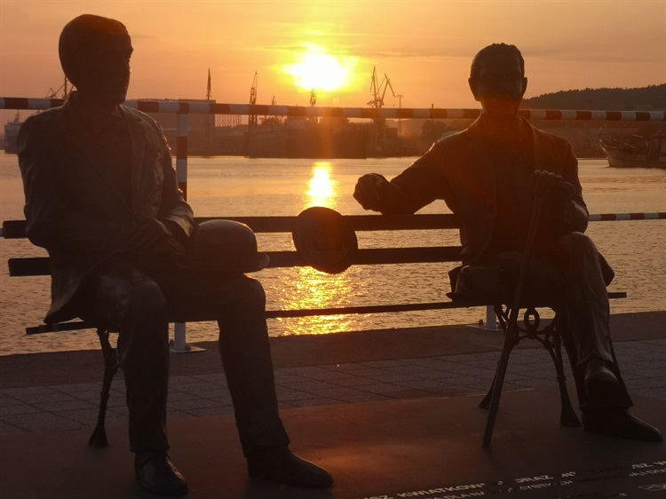 Tadeusz Wenda i Eugeniusz Kwiatkowski to budowniczowie portu gdyńskiego. Z okazji 100-lecia Portu Gdynia odsłonięto ich pomnik. Siedzą sobie na ławce z brązu i podziwiają swoje dzieło.