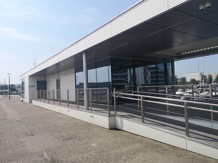 Nowoczesny budynek z pięknym, zadaszonym tarasem zapewniający łazienki i zaplecze techniczne żeglarzom.