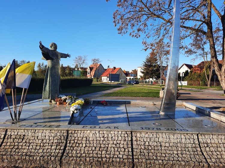 Pomnik Jana Pawła II znajduje się przy rondzie noszącym jego imię. Odsłonięcie miało miejsce w październiku 2008 roku, z okazji obchodów Dni Papieskich. Autorem pomnika jest rzeźbiarz Jarosław Wójcik.