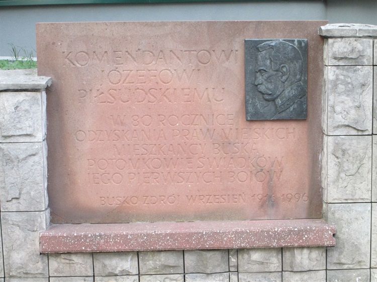 Tablica upamiętniająca Józefa Piłsudskiego odsłonięta została w 1996 roku z okazji 80-rocznicy odzyskania przez Busko praw miejskich. Kamienna płyta wykonana jest z charakterystycznego świętokrzyskiego czerwonego piaskowca. Oprócz pamiątkowego napisu widnieje na niej medalion z wizerunkiem marszałka.