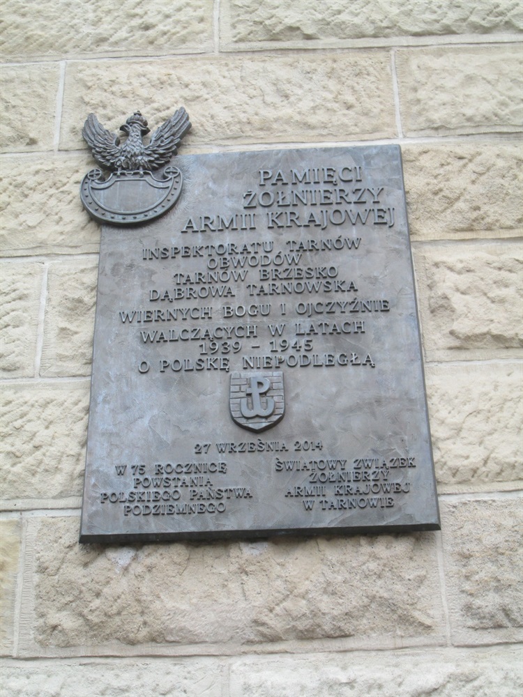 Tablica upamiętniająca żołnierzy Armii Krajowej znajduje się na bocznej ścianie budynku przy ulicy Wałowej od strony Placu Ofiar Katynia. Ufundowana została 27 września 2014 roku, w 75-rocznicę powstania Polskiego Państwa Podziemnego staraniem Światowego Związku Żołnierzy Armii Krajowej. Wykonana jest z białego marmuru. Oprócz napisu pamiątkowego na tablicy widnieje orzełek wojsk lądowych Wojska Polskiego oraz Znak Polski Walczącej.