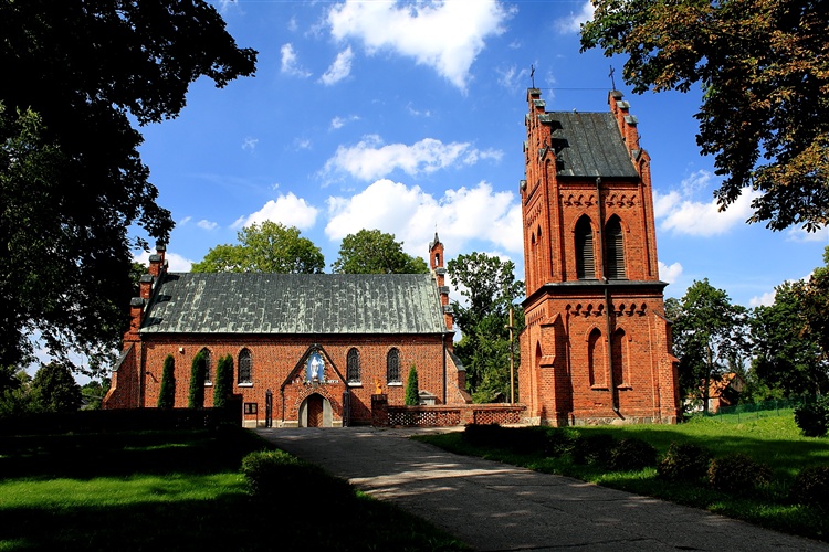 Pierwsze wzmianki o nim pochodzą z 1448 r. a powstał zapewne na przeł. XIV i XV w. Jest budowlą gotycką, ceglaną, na kamiennej podmurówce. Wnętrze jest salowe nakryte płaskim stropem. Wejścia - główne i z kruchty bocznej oraz prowadzące do zakrystii mają skromne, ostrołukowe portale z profilowanej cegły.