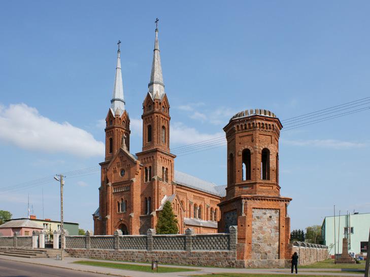 Kościół, trójnawowy, w stylu późnoromańskim, zbudowany został wg projektu architekta Zygmunta Kmity, budowniczego powiatowego z Mławy. W 1902 roku dobudowano plebanię. II wojna światowa uszkodziła nieco budowlę, zniszczenia zostały jednak szybko odremontowane. We wnętrzu kościoła znajdują się 16-głosowe organy sprowadzone przez ks. Franciszka Gajewskiego. Na ołtarzu głównym widnieje rzeźba Ostatniej Wieczerzy.