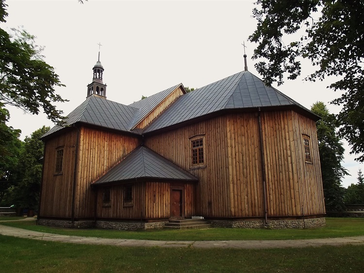 Nad nawą i prezbiterium oddzielne dachy dwuspadowe, nad transeptem i prezbiterium przechodzące w trójpołaciowe. Nad zakrystią i składzikiem daszki dwupołaciowe. Na kalenicy nad nawą kwadratowa wieża czterokondygnacyjna zakończona ośmioboczną ażurową wieżyczką na sygnaturkę. Wnętrze obszerne, jednonawowe, przekryte stropem płaskim z zaskrzynieniami. Skrzydła transeptu oddzielone od nawy parą kolumn. Chór muzyczny wsparty na dwóch słupach.