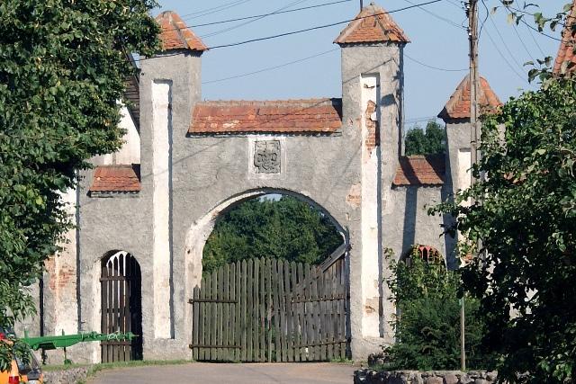 Pozostałości zespołu pałacowego (XVII-XIX w.) z bramą wjazdową, budynkami gospodarczymi, mostem w parku krajobrazowym.