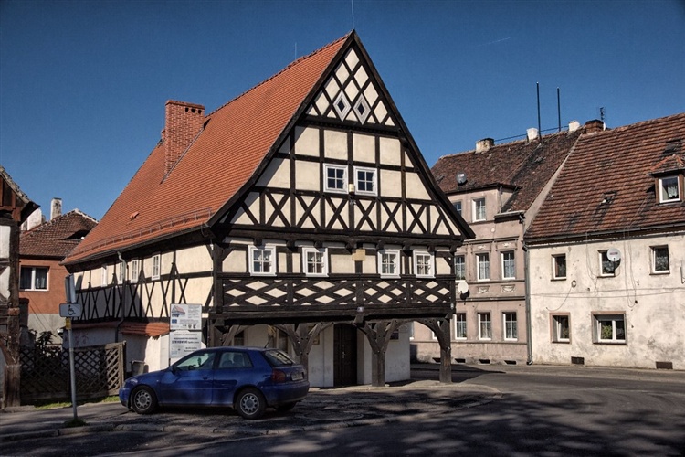 Widok rynku w Sulikowie kojarzy się z zabudową średniowiecznych miast Niemiec czy Francji. Domy z białymi ścianami, od których wyraźnie odcinają się ciemne belki konstrukcji, często spotyka się na zachód od Odry. Podcieniowe domy na rynku w Sulikowie są pięknym przykładem rozwiązań nieznanych w środkowej czy wschodniej Polsce. Ustawione szczytem do rynku, mają ogromne dachy o wysokości równej łącznej wysokości ścian parteru i pierwszego piętra. Ściany piętra mają oryginalną konstrukcję szkieletową. Podobnie zbudowano szczyt, który wysuwa się przed obrys parteru i wspiera na czterech słupach, tworząc od strony rynku sympatyczne podcienia. Jedynie parter budynku ma grube murowane ściany. Te szachulcowe domy podcieniowe powstałe po wielkim pożarze, który w 1814 r. strawił większą część miasta, to jedyne zachowane w Polsce obiekty tego typu i zarazem wielka atrakcja Sulikowa.