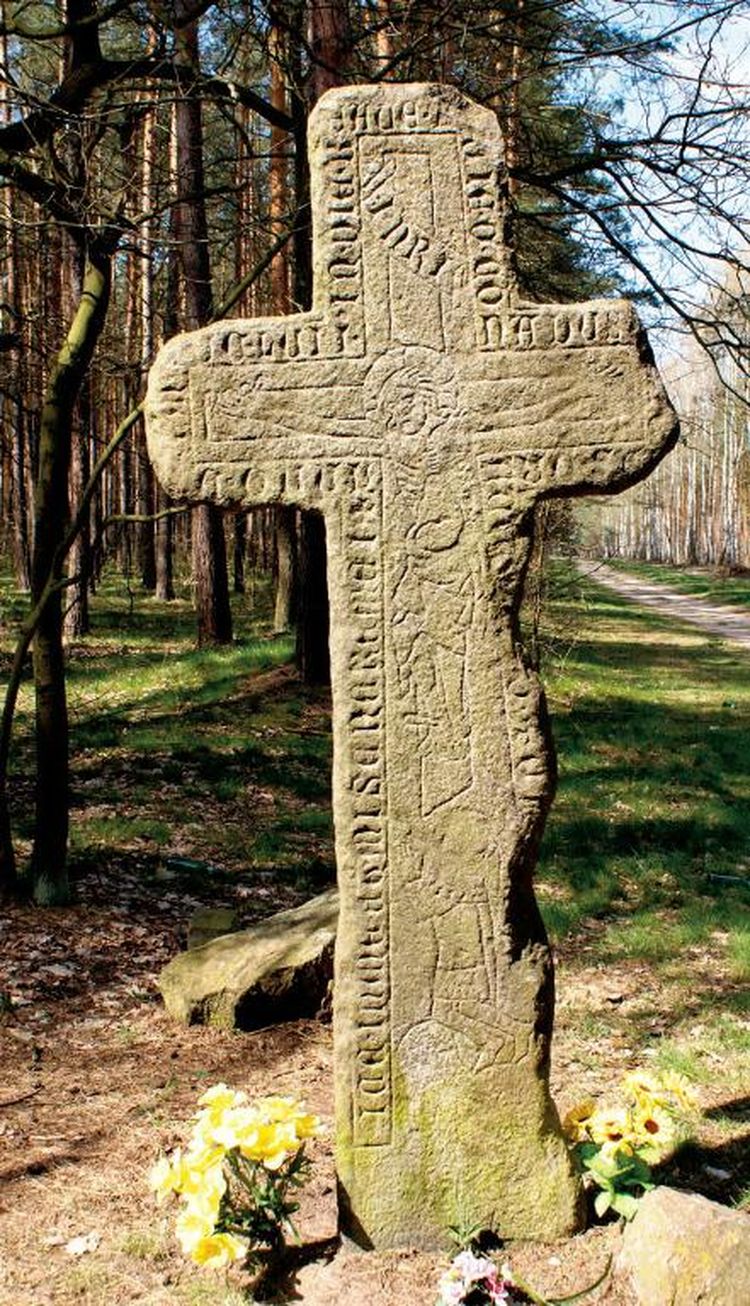 Granitową powierzchnię ozdabia ryt przedstawiający Chrystusa na krzyżu i postać modlącą się u jego stóp. Krawędź obiega na całej długości gotycki napis. Podobno krzyż na leśnej drodze z Kijowic do Zawidowic stanął w połowie XIV w., upamiętniając dokonaną w tym miejscu zbrodnię bratobójstwa.