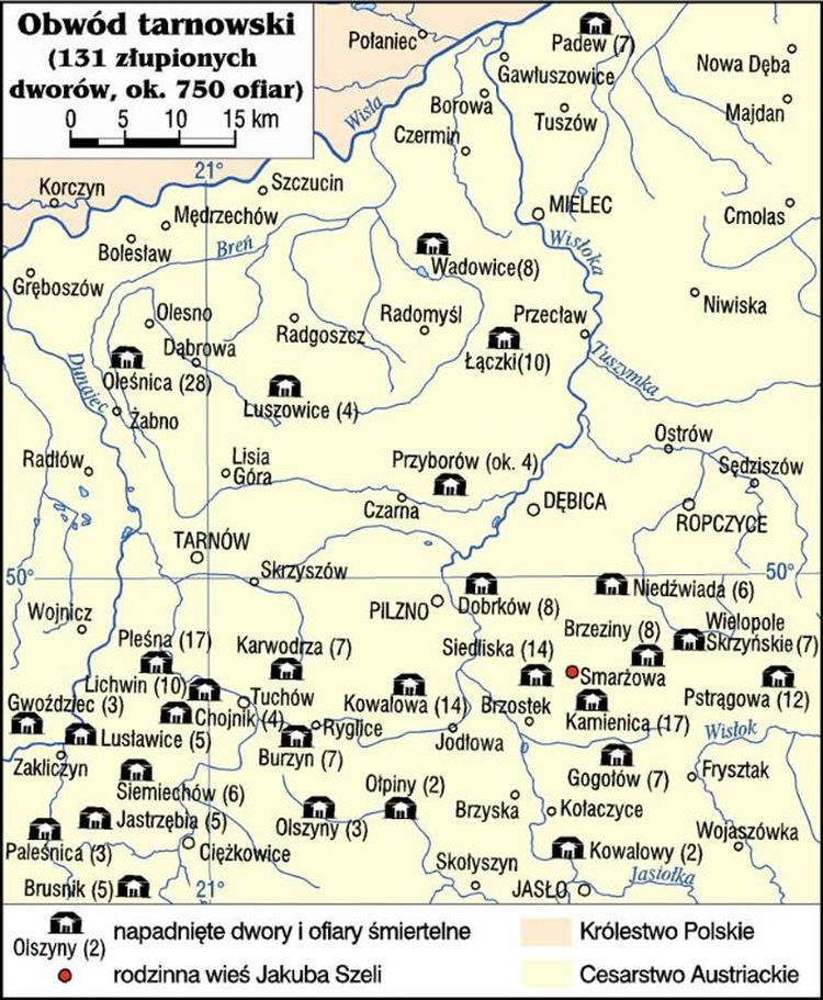 Sam Jakub Szela był odpowiedzialny za śmierć 23 osób z Siedlisk i Smarżowej, należących do znienawidzonej przez niego rodziny Boguszów. Ale rozpoczęta przez Szelę akcja wymknęła się spod kontroli austriackich władz. Wieśniacy z powiatu tarnowskiego zaczęli napadać na dwory i w bestialski sposób zabijać ich mieszkańców. Niedługo później pogrom rozszerzył się, obejmując całą zachodnią i środkową Galicję. Jego ofiarą padło ok. 470 rodzin. Wyrzynano nie tylko szlachtę, w okolicy Bochni atakowano wszystkich bez wyjątku austriackich urzędników. W ciągu niecałych trzech tygodni zamordowano ok. 1500 osób.