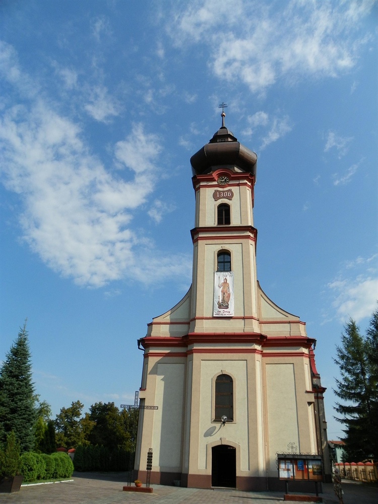 Świątynię wybudowano w 1800 roku, w miejscu, jak podają dość popularnie kroniki parafialne i inne źródła pisane, wcześniejszego drewnianego. W 1913 roku, co jest udokumentowane na wieży kościelnej, istniejący kościół powiększono przez wybudowanie nowego transeptu, prezbiterium i nadbudowano wieżę. Wieżę zdobił niegdyś pokryty blachą barokowy hełm cebulasty, który spłonął w maju 2009 roku.