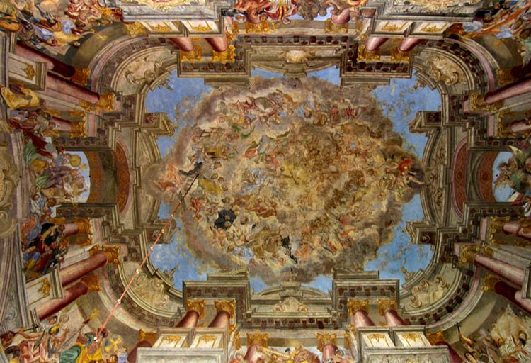 Wnętrze świątyni pokrywają wspaniałe iluzjonistyczne polichromie pędzla jezuity Jana Kubena, wykonane w latach 1739-1745; które warto zobaczyć. Malowidła przedstawiają chwałę Krzyża Świętego oraz sceny z Nowego Testamentu i postacie świętych.