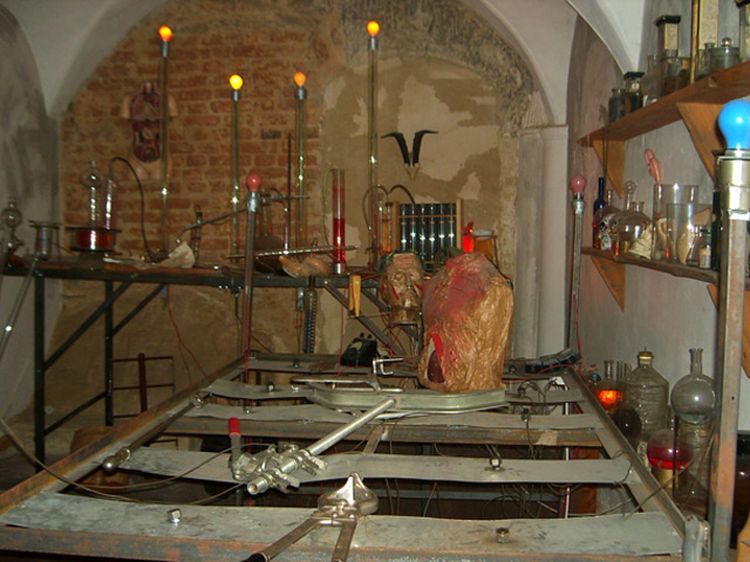 W Izbie Pamiątek znajduje się też osobliwa atrakcja Laboratorium doktora Frankensteina z ekspozycją dziwnych i tajemniczych przedmiotów, związanych z legendą o słynnym potworze. Skąd Frankenstein w Ząbkowicach? Od początku swego istnienia (XIII w.) aż do 1945 r. Ząbkowice Śląskie nosiły nazwę Frankenstein. Ale to prawdopodobnie jedyna zbieżność. Są jednak zwolennicy teorii, że dramatyczne wydarzenia, które miały tu miejsce na początku XVII w., stanowiły inspirację dla Mary Shelley, gdy pisała swą książkę Frankenstein, czyli nowoczesny Prometeusz. W 1607 r. w mieście wybuchła epidemia, w czasie której zmarł co trzeci jego mieszkaniec. Jak się okazało, przyczyną tak wielkiej umieralności była przestępcza działalność miejscowych grabarzy, którzy ze zwłok produkowali śmiercionośny proszek, a następnie rozsypywali go po domach. Oskarżonych skazano na śmierć, a wyrok wykonano w wyjątkowo okrutny sposób - z wyrywaniem kciuków, obcinaniem dłoni i przypiekaniem włącznie. Z czasem powstała legenda o strasznym potworze, który miał rzekomo wywołać pomór w Ząbkowicach. Od 1995 r. w Ząbkowicach Śląskich organizowany jest Weekend z Frankensteinem. Na tę imprezę zapraszane są inne potwory - Drakula i Golem, odbywają się przeglądy filmów grozy, plenerowe pokazy horrorów, a także Mistrzostwa Polski Katów.
