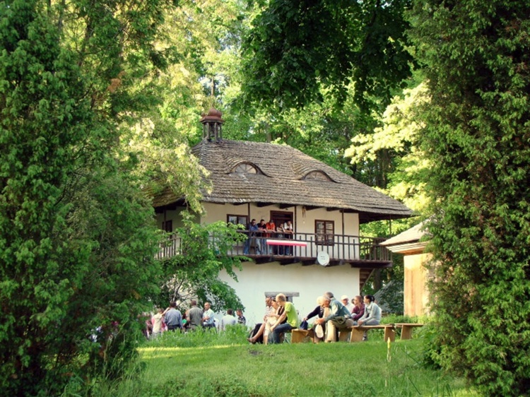 W pięknym parku sąsiadującym z kompleksem stawów stoi stary polski dwór otoczony ozdobnymi krzewami i kwiatami. Obok niego przycupnął niewielki piętrowy dom nakryty gontowym dachem.