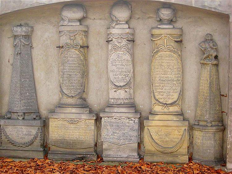 Pole nowego cmentarza wschowskiego otoczono solidnym murem, przeznaczonym na epitafia dla możnych i zasłużonych obywateli miasta. Są wśród nich XVII- i XVIII-wieczne kamienne tablice epitafijne burmistrzów, kasztelanów, dostojnych rajców, sędziów, pastorów, lekarzy, kupców oraz mistrzów cechowych. Napisy na tablicach, większość w języku niemieckim, ale także po łacinie, podają najważniejsze fakty z życia zmarłych: daty urodzin i śmierci, małżeństwa, koligacje rodzinne, wykształcenie, zawód, zasługi. Często są to długie, barwne opowieści, pisane jeszcze za życia przez bohaterów epitafiów. Te kamienne tablice dostarczają wielu informacji o dziejach miasta i losach jego mieszkańców.