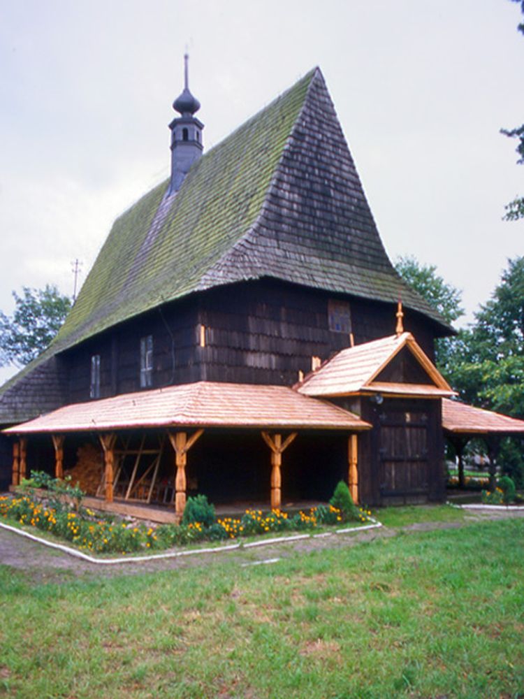 Najstarszy z trzech gidelskich kościołów – modrzewiowy, w całości pokryty gontem (zarówno dach, daszki nad sobotami i oszalowanie ścian) – zbudowany został na przełomie wieków XV i XVI. Z całą pewnością nie był pierwszą stojąca w tym miejscu świątynią, gdyż parafia w Gidlach istniała już w XII w. a kościół miał być pobudowany w drugiej połowie XI w. Tak przynajmniej mówią miejscowe przekazy (chociaż na belce nad drzwiami widnieje data 1173).