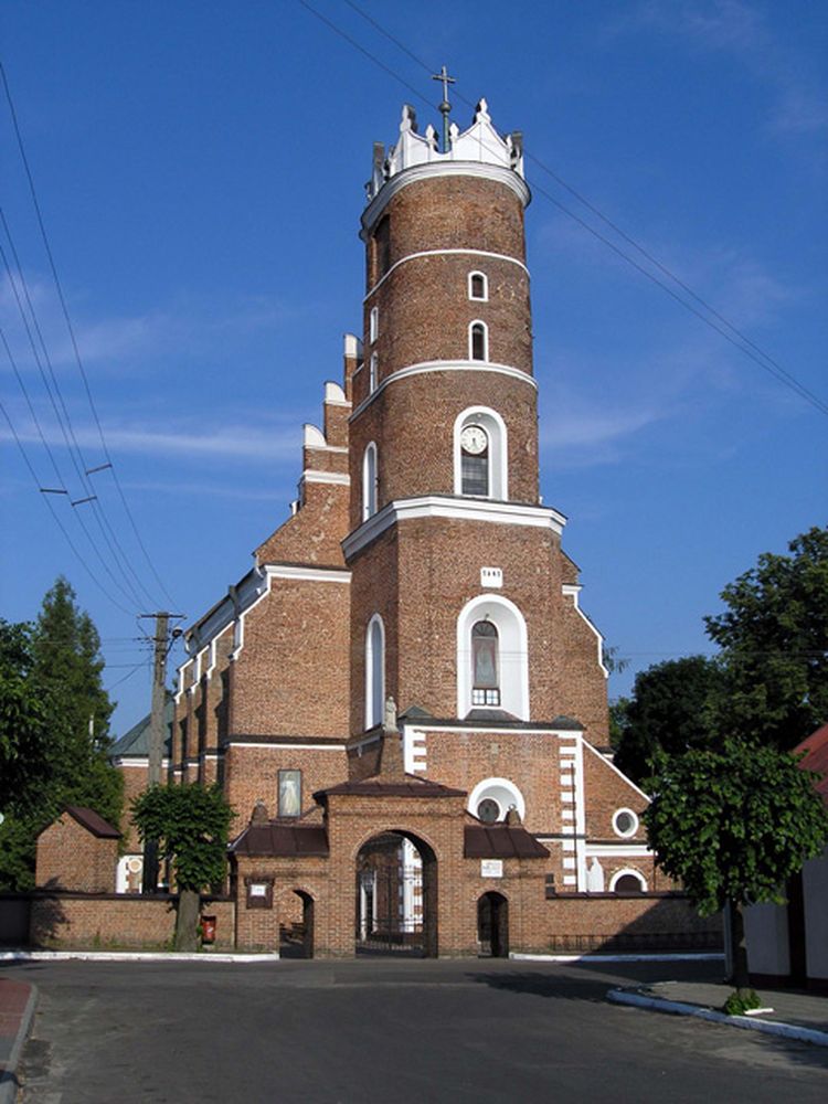 Budowla orientowana,jednonawowa, z pięciokondygnacyjną- 35 metrową wieżą zwieńczoną attyką,dzięki której stanowi dominantę w panoramie miasteczka. Zbudowana z cegły - podstawowy materiał budulcowy uzupełniają detale kamienne, nie tynkowana. Na uwagę zasługują: XVIII-wieczny ołtarz główny, w stylu barokowym, w nim XVII wieczny obraz Matki Boskiej Loretańskiej przeniesiony w 1785 roku z dawnego kościoła jezuitów na wyspie, a także późnorenesansowa chrzcielnica z 1613 roku, nagrobne płyty fundatorów kościoła z czerwonego marmuru i barokowe konfesjonały.Pomimo przebudów i wielu remontów świątynia nie uległa zasadniczym przemianom.