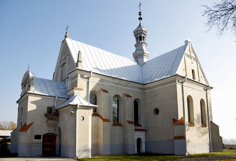Murowany kościół pw. Wniebowstąpienia Najświętszej Marii Panny wzniesiono w XIV w. z fundacji Kazimierza Wielkiego, a przebudowano na przełomie XVI-XVII w. Początkowo obiekt pełnił rolę kaplicy zamkowej (nawa główna). Część prezbiterialna została dobudowana znacznie później. W 1604 r. kościół był konsekrowany a restaurowany w 1825 a następnie w 1917 r.