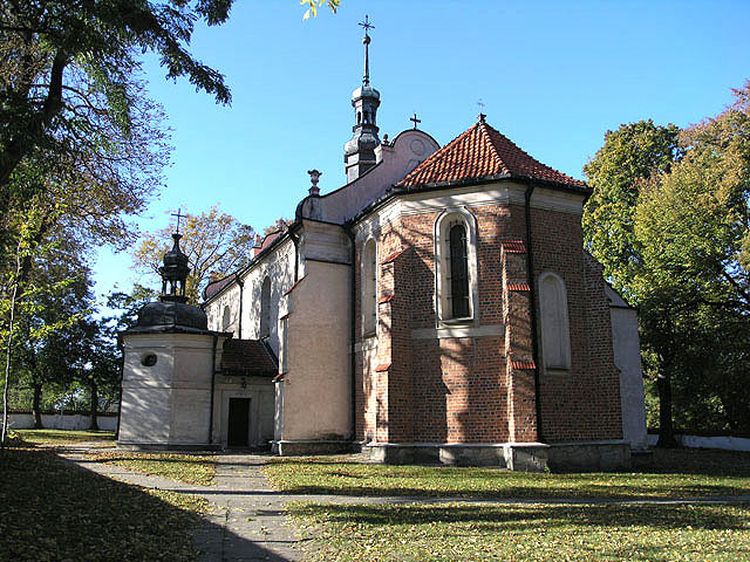 Pierwszy, drewniany kościół został ufundowany w tym miejscu w 1226 r. przez biskupa Iwona Odrowąża. Kościół gotycki, powstały w latach 1426-34, był rozbudowany i przebudowany w 1637 r. i w latach 1728-45. Kościół jest jednonawowy, z trójbocznie zamkniętym prezbiterium. Warto zwrócić uwagę na barokową kaplicę św. Barbary (1706-19). Efektem barokowej przebudowy jest też sztukatorska dekoracja sklepień i snycerskie wyposażenie wnętrza - ołtarze, chór organowy, stalle w prezbiterium i ambona.