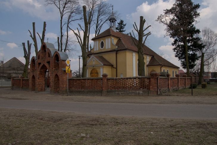 Kościół wzniesiony został w latach 1926–1927. W otaczającym go murze znajduje się neogotycka brama-dzwonnica. Kościół jest świątynią filialną parafii w Rąbiniu.
