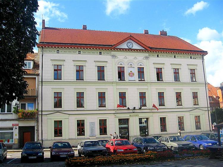 Ratusz i późnoklasycystyczne domy (XIX w.). Obecny Ratusz został wzniesiony w połowie XIX wieku, po zniszczeniu starego przez wojska francuskie w 1806 roku. W latach 1998-2000 został gruntownie wyremontowany i rozbudowany według projektu Wiesława Vovie. Na fasadzie budynku znajduje się tablica pamiątkowa ku czci mieszkańców miasta zamordowanych w niemieckich obozach koncentracyjnych i więzieniach w czasie II wojny światowej.