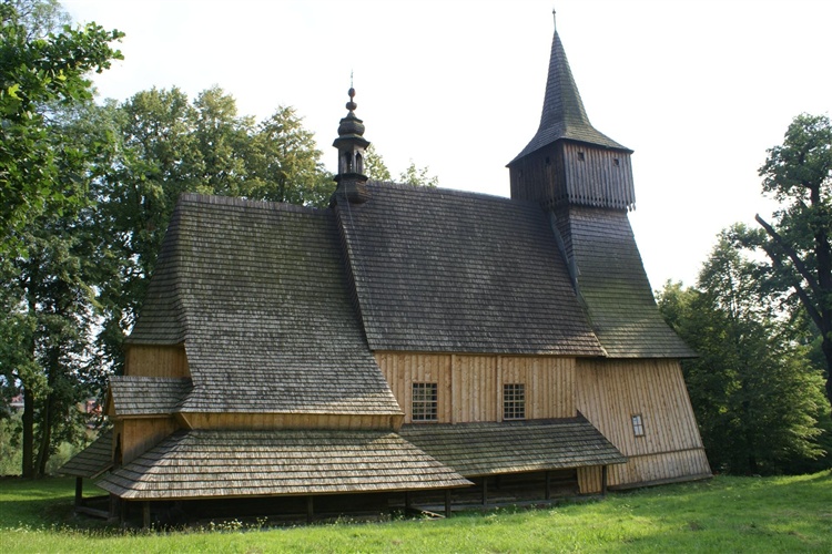 Jego kwadratowa wieża frontowa, o pochyłych ścianach i efektowna wieża na sygnaturkę, o kształcie cebulastym z latarnią, zwracają do dzisiaj na siebie uwagę interesującą konstrukcją. Pierwotnie miała kształt sześciogranny, zdobiona sobotami, ale ok. 1802 r. uległa spaleniu w pożarze w wyniku uderzenia pioruna, który szczęśliwym zbiegiem okoliczności nie rozprzestrzenił się na całość, ponieważ ugasiła go gwałtowana ulewa po burzy. Były w niej trzy dzwony, przeniesione później do nowo wybudowanego kościoła murowanego, skąd w 1916 r. zarekwirowane zostały przez austriackie władze wojskowe.