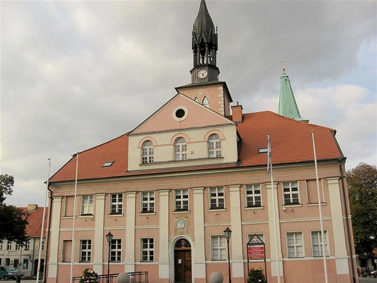 Murowany budynek ratusza z piętrem o konstrukcji ryglowej wzniesiono w 1581 r. na miejscu starszej, prawdopodobnie drewnianej budowli (jej relikty widoczne są w ścianach piwnic i fundamentach). Spłonął w 1666 i został odbudowany z wykorzystaniem zachowanych murów parteru. Podwyższono wówczas wieżę. Po kolejnym pożarze w XVIII w. odbudowano go już w całości z cegły. Następny pożar miasta (1827) spowodował konieczność jeszcze jednego kapitalnego remontu. Barokowa wcześniej budowla otrzymała cechy klasycystyczne a wieża zyskała neogotyckie zwieńczenie i hełm. W obecnej postaci od 1813 r.