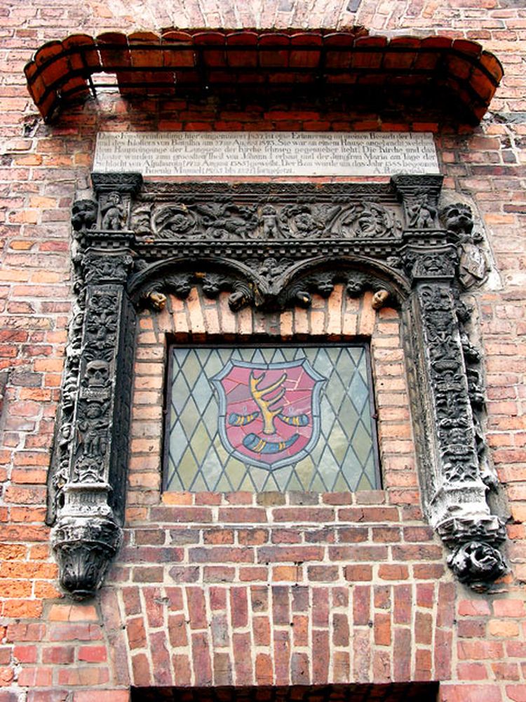 Właścicielem dóbr obrzyckich był Atanazy Raczyński. To on, pełniąc obowiązki ambasadora Prus w Lizbonie, w 1843 r. z klasztoru w Batalha we wschodniej Portugalii przywiózł piękne obramienie, które w 1857 r. wmurowano w prostą bryłę budynku. Umieszczono nad nim tablicę z napisem w języku niemieckim (wszak Obrzycko znajdowało się na ziemiach zaboru pruskiego) wyjaśniającym pochodzenie tego niezwykłego detalu architektonicznego. Dziś wewnątrz obramienia znajduje się witraż z herbem Obrzycka.