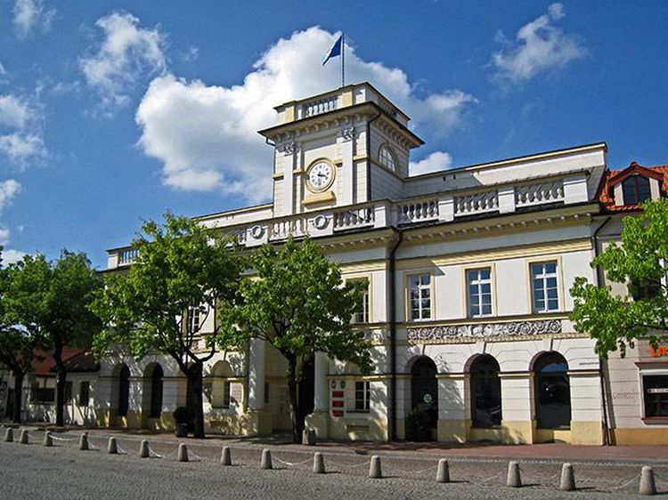 Jest to budynek na planie prostokąta, dwukondygnacyjny z charakterystyczna wieżą, na której znajduje się zegar wybijający miejskie kuranty - atrakcja dla dzieci. Na piętrze znajduje się sala radziecka, miejsce posiedzeń Rady Miejskiej. Salę ozdobiono pięknymi malowidłami przedstawiającymi 36 herbów dawnych województw i ziem Królestwa Polskiego oraz portrety: Henryka Sienkiewicza, Tadeusza Kościuszki, króla Kazimierza Wielkiego, arcybiskupa Jana Łaskiego i Stanisława Staszica autorstwa Józefa Lamparskiego z Warszawy (1918 r.)