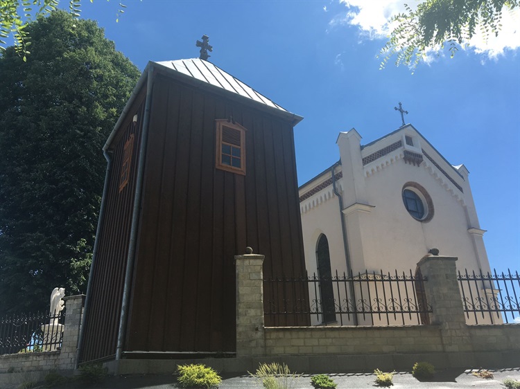 Kościół św. Anny (1869), drewniana dzwonnica, stara plebania.