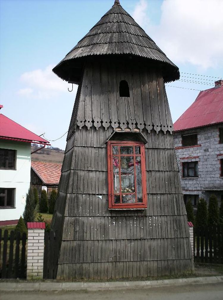 Dzwonnica została zbudowana w 1837 r. Ma kształt czworoboku i drewnianą konstrukcję słupową. Ściany są pochyłe, pokryte są w dolnej części gontami. Górna część jest pionowa, zbudowana z desek, zdobionych u dołu. Ta część dzwonnicy posiada ze wszystkich stron okienka, nawiązując tym samym do konstrukcji izbicowych zabytkowych, drewnianych kościołów i kapliczek regionu. Dach ma kształt niskiego ostrosłupa z dużym okapem, kryty jest gontem. W szczycie znajduje się żelazny krzyż.