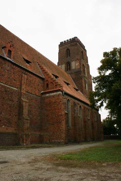 Korpus główny jest czteroprzęsłowy, posiada od wschodu węższe dwuprzęsłowe prezbiterium. W 1523 roku dobudowano kryptę, a w latach 1529-1531 piętrową kaplicę. W roku 1645 dobudowano skarbczyk. Wewnątrz kościoła, w prezbiterium, nawach bocznych i kruchcie pod wieżą znajduje się sklepienie gwiaździste, a w nawie głównej barokowe krzyżowe.