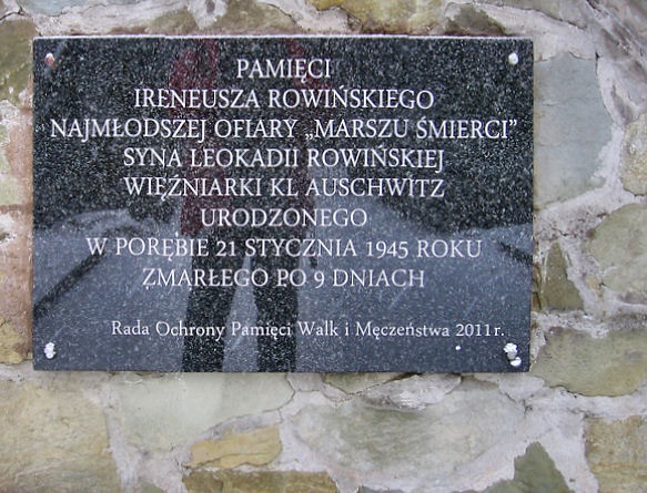 Ireneusz Rowiński stał się symbolem dzieci pochłoniętych przez oświęcimskie „piekło”. Ciężarna Leokadia Rowińska, trafiła do Auschwitz II –Birkenau w 1944r. z powstańczej Warszawy. Dzieląc los obozowych matek, po ogłoszeniu ewakuacji obozu, zdając sobie sprawę, że pozostanie na miejscu skazuje ją i dziecko na niechybną śmierć, wyruszyła w dniu 18.01.1945r. na trasę Marszu Śmierci. Z kolumną ewakuacyjną przebyła blisko 30 km. Po przejściu Pszczyny, podczas nocnego postoju we wsi Poręba, na strychu folwarku należącego do niemieckiej rodziny, 21.01.1945r. urodziła syna, któremu nadano imię Ireneusz. Dziecko wkrótce zmarło i matka pochowała go w kartonowym pudełku po makaronie pod pobliską przydrożną kapliczką.